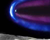 An artist's impression of the view of the Earth from the Moon if we could see in X-rays. The Earth is surrounded by an X-ray glow caused by particles from the Sun colliding with the gas trapped within the Earth's magnetic shield.