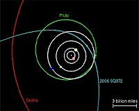 Chicago IL (SPX) Aug 15, 2008 A "minor planet" with the prosaic name 2006 SQ372 is just over two billion miles from Earth, a bit closer than the planet Neptune. But this lump of ice and rock is beginning the return leg of a 22,500-year journey that will take it to a distance of 150 billion miles, nearly 1,600 times the distance from the Earth to the Sun, according to a team of researchers from the Sloan Digital Sky Survey (SDSS-II). The discovery of this remarkable object was reported in Chicago, at an international symposium titled "The Sloan Digital Sky Survey: Asteroids to Cosmology." A paper describing the discovery technique and the properties of 2006 SQ372 is being prepared for submission to The Astrophysical Journal. The orbital paths of the major planets are nearly circular, but the orbit of 2006 SQ372 is an ellipse that is four times longer than it is wide, said University of Washington astronomer Andrew Becker, who led the discovery team. The only known object with a comparable orbit is Sedna -- a distant, Pluto-like dwarf planet discovered in 2003 -- but 2006 SQ372's orbit takes it more than one-and-a-half times further from the Sun, and its orbital period is nearly twice as long. The new object is much smaller than Sedna, Becker said, probably 30-60 miles across instead of nearly 1,000. "It's basically a comet, but it never gets close enough to the Sun to develop a long, bright tail of evaporated gas and dust." Becker's team found 2006 SQ372 by applying a specialized computer searching algorithm to data taken for a completely different purpose: finding supernova explosions billions of light years away to measure the expansion of the universe. The SDSS-II supernova survey scanned the same long stripe of sky, an area 1,000 times larger than the full moon, every clear night in the fall of 2005, 2006, and 2007. "If you can find things that explode, you can also find things that move, but you need different tools to look for them," said team member Lynne Jones, also of the University of Washington. The only objects close enough to change position noticeably from one night to the next are in our own solar system, Jones explained. SQ372 was first discovered in a series of images taken between September 27 and October 21, 2006. Team member Andrew Puckett, of the University of Alaska Anchorage, then searched the supernova survey's Fall 2005 observations to find earlier detections, thus securing the discovery. Subsequent SDSS detections of SQ372 have been found in data from the 2006 and 2007 observing seasons. University of Washington graduate student Nathan Kaib, another member of the discovery team, has been running computer simulations to try to understand out how 2006 SQ372 might have acquired its unusual orbit. "It could have formed, like Pluto, in the belt of icy debris beyond Neptune, then been kicked to large distance by a gravitational encounter with Neptune or Uranus," said Kaib. "However, we think it is more probable that SQ372 comes from the inner edge of the Oort Cloud." In 1950, Kaib explained, the Dutch astronomer Jan Oort hypothesized that most comets come from a distant reservoir of icy, asteroid-like bodies, which were ejected from the inner solar system by gravitational kicks from the giant planets as the planets themselves were forming four and a half billion years ago. Most objects in the Oort cloud orbit the Sun at distances of several trillion miles, but the gravity of passing stars can alter their orbits, flinging some into interstellar space and deflecting others to the inner solar system where they "light up" as comets. Even at its most distant turning point, 2006 SQ372 will be ten times closer to the Sun than the supposed main body of the Oort Cloud, said Kaib. "The existence of an 'inner' Oort cloud has been theoretically predicted for many years, but SQ372 and perhaps Sedna are the first objects we have found that seem to originate there. It's exciting that we are beginning to verify these predictions." Becker noted that 2006 SQ372 was bright enough to find with the SDSS only because it is near its closest approach to the Sun, and that the SDSS-II supernova survey observed less than one percent of the sky. "There are bound to be many more objects like this waiting to be discovered by the next generation of surveys, which will search to fainter levels and cover more area," said Becker. "In a decade, we should know a lot more about this population than we do now." "One of our goals," said Kaib, "is to understand the origin of comets, which are among the most spectacular celestial events. But the deeper goal is to look back into the early history of our solar system and piece together what was happening when the planets formed." Related Links Sloan Digital Sky Survey (SDSS) The million outer planets of a star called Sol