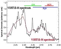 Paris, France (ESA) Feb 05, 2008 Since the successful orbit insertion of Venus Express in April 2006, the VIRTIS instrument has gathered numerous high-resolution spectra of Venus' atmosphere in the wavelength range 2-5 micron. Taking advantage of a broad spectral window around 2.3 micron, the data has allowed for mapping of minor constituents in the deep atmosphere below the planet's thick cloud deck. VIRTIS, the Visible and Infrared Thermal Imaging Spectrometer, comprises two channels: - a mapping channel (M-channel) that provides images at multiple wavelengths in the band 0.25-5 �m - a high-resolution channel (H-channel) that provides high resolution spectra in the wavelength range 2-5 �m Using the high-resolution VIRTIS-H channel, a team of astronomers led by Emmanuel Marcq has measured the abundances of several minor components in the lower atmosphere between 30-40 km altitude. Thermal emission from these hot (200 degrees C at 35 km) layers of the lower atmosphere is able to escape through the huge amount of CO2 and the thick overlying cloud layers through a spectral window in a broad band around 2.3 �m. On the nightside of Venus this emission can be observed unhindered by the more intense reflected sunlight. Figure 1 is an overlay of two example nightside spectra of Venus' lower atmosphere around 2.35 �m taken with the two different channels of the VIRTIS instrument. The dark red line shows a lower resolution spectrum obtained with the M-channel during the Venus orbit insertion in April 2006. The black line shows a higher resolution spectrum obtained with the H-channel during orbit #277. Both spectra clearly show the broad absorption feature identified as a CO spectral band. The finer resolution of the H-channel allows for additional molecule species to be identified from their less pronounced spectral features also indicated in the figure, which include water vapour (H2O) and carbonyl sulphide (OCS). The relative depth of the spectral features is directly related to the abundance of the corresponding absorbing constituent in the lower atmosphere. Using a radiative transfer computer model, Marcq et al. were able to derive constraints on the vertical profiles of CO, OCS and H2O in the 30-40 km altitude range. The model goes up to latitudes unreacheable with ground-based instruments (that cover only up to 60 degrees latitude) as the quasi-polar orbit of Venus Express allows for VIRTIS to observe the lower atmosphere emission also from polar latitudes. Also the VIRTIS observations provide more accurate measurements of the abundances.
