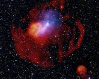 G327.1-1.1 is the aftermath of a massive star that exploded as a supernova in the Milky Way galaxy. A highly magnetic, rapidly spinning neutron star called a pulsar was left behind after the explosion and is producing a wind of relativistic particles, seen in X-rays by Chandra and XMM-Newton (blue) as well as in the radio data (red and yellow). This structure is called a pulsar wind nebula ... read more