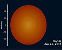 Artist's impression of the evolution of the shell as deduced from the observations made in the mid-infrared (in the visible, it is almost opaque), using ESO's Very Large Telescope Interferometer. The sequence starts on 28 February, i.e. about 20 days after the nova erupted. At that time, the material of the ejecta starts to cool and to condense. On 13 March, dust forms, obscuring the source, which is no longer detectable at visible wavelengths. This shell, initially opaque, will expand and dilute itself, while the inner regions continue to produce dust. The outer zones become transparent but a new shell of dust is formed at the end of the sequence, and can be seen as a bright circle. Because of this, the nova further dims for a few additional months. To view the full video please go here.