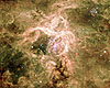 Boston MA (SPX) Dec 12, 2008Found in the nearby Large Magellanic Cloud, 30 Doradus is one of the largest massive star forming regions close to the Milky Way. Enormous stars in 30 Doradus, also known as the Tarantula Nebula, are producing intense radiation and searing winds of multimillion-degree gas that carve out gigantic bubbles in the surrounding cooler gas and dust. |