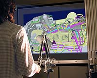 Derio, Spain (SPX) Jun 22, 2007 Firstly, what is "Haptics"? This term means "of or relating to the sense of touch". Haptic technology, or haptics, refers to the technology that connects the user to a computerized system via the sense of touch by applying forces, vibrations and/or motions to the user. Perhaps people do not realize it, but haptic technology is already in our lives. Vibrating phones, gaming controllers and force-feedback control knobs in cars, like BMW's iDrive, are examples of this technology. These days, you can turn your phone ring tone off, put it in your purse and still feel that someone is calling you when you get a vibration. On the other hand, the Nintendo Wii video game console has been a new revolution for game lovers. The controller, called Wii, provides vibrations (i.e. when you hit the ball in a tennis game) which enhances the virtual sensation. However, these examples are only the beginning of a cutting-edge technology. In terms of user-computer interaction, touch offers a new way of interacting or manipulating our screen. We used to just have vision and sound, now we also have touch. Thanks to haptic devices, such as, the most well-known PHANToM haptic devices or hand exoskeleton devices (Figure 1.c), "you can feel or touch what you see", recognize object shapes, textures, stiffness or grasp them and feeling their weight. Such devices are being used now for virtual modeling, medicine, education, assistive technology for blind people, as well as industrial design and maintenance. Our work addresses the industrial field. Currently, physical prototypes are replaced by virtual or digital prototypes/models (Computer Aided Design - CAD) to avoid building expensive prototypes, especially in the automotive and aeronautics sectors. Increasingly, these CAD systems also allow designers and engineers to carry out assembly processes. The use of touch in CAD systems allows operators to feel forces and local stimuli similar to those in real situations, which provides more intuitive manipulation (i.e. check any defect or decide the most appropriate assembly sequence). On the other hand, different designers, which may be situated over a thousand kilometers away, often collaborate in the design and revision of products to lessen time and lower costs. The objective of this thesis is to research and provide solutions for collaborative haptic assembly systems, where several designers in different locations can grasp virtual parts and assemble them into a digital engine or other mechanical parts. To achieve it, a Collaborative Haptic Assembly Simulator, called CHAS, was developed, where two designers can collaborate together in real-time. Trials between Labein (Derio, Bizkaia) and Queen's University Belfast (Northern Ireland) have verified this system. When performing the assembly task, the operator in Bizkaia could assemble a part into another part grasped by the remote operator in Belfast. Furthermore, the operator in Belfast could feel the collisions with the part grasped by the remote operator. This is a small step towards new systems of collaboration over the Internet, or a new way of interacting over distance. Doctors will have the ability to remotely diagnose and operate on patients, or we will be able to shake hands virtually. Greetings from Canada, where I am trying to overcome those challenges. Related Links Labein Queen's University Belfast Space Technology News - Applications and Research