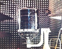 The photo shows AZUR, still on Earth, in an anechoic chamber. Here, the performance data for the onboard antennas and the reflection characteristics of the entire satellite were determined. Credit: Messerschmitt-Bolkow-Blohm.