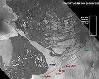 Paris, France (ESA) Dec 04, 2008 New rifts have developed on the Wilkins Ice Shelf that could lead to the opening of the ice bridge that has been preventing the ice shelf from disintegrating and breaking away from the Antarctic Peninsula. The ice bridge connects the Wilkins Ice Shelf to two islands, Charcot and Latady. As seen in the Envisat image above acquired on 26 November 2008, new rifts (denoted by colourful lines and dates of the events) have formed to the east of Latady Island and appear to be moving in a northerly direction. Dr Angelika Humbert from the Institute of Geophysics, Munster University, and Dr Matthias Braun from the Center for Remote Sensing, University of Bonn, spotted the newly formed rifts during their daily monitoring activities of the ice sheet via Envisat Advanced Synthetic Aperture Radar (ASAR) acquisitions. "These new rifts, which have joined previously existing rifts on the ice shelf (blue dotted line), threaten to break up the chunk of ice located beneath the 21 July date, which would cause the bridge to lose its stabilisation and collapse," Humbert explained. "These recent changes are happening slower and more continuously than the events we saw earlier this year." In February 2008 an area of about 400 square kilometers broke off from the ice shelf, narrowing the ice bridge down to a 6 km strip. At the end of May 2008 an area of about 160 square kilometer broke off, reducing the ice bridge to just 2.7 km. Between 30 May and 9 July 2008, the ice shelf experienced further disintegration and lost about 1 350 square kilometer. The Wilkins Ice Shelf, a broad plate of floating ice south of South America on the Antarctic Peninsula, had been stable for most of the last century before it began retreating in the 1990s. The peninsula has been experiencing extraordinary warming in the past 50 years of 2.5 degrees C. If the ice shelf breaks away from the peninsula, it will not cause a rise in sea level since it is already floating. However, ice shelves on the Antarctic Peninsula are sandwiched by extraordinarily raising surface air temperatures and a warming ocean, making them important indicators for on-going climate change. Long-term satellite monitoring over Antarctica is important because it provides authoritative evidence of trends and allows scientists to make predictions. Over the last 17 years, ESA's ERS and Envisat satellite missions have been the main vehicles for testing and demonstrating the use of Earth Observation data in Polar Regions. In the past 20 years, seven ice shelves along the Antarctic Peninsula have retreated or disintegrated, including the most spectacular break-up of the Larsen B Ice Shelf in 2002, which Envisat captured within days of its launch. Envisat's ASAR instrument is particularly suited to acquire images over Antarctica during the local winter period because it is able to produce high-quality images through bad weather and darkness, conditions often found in the area. Daily ASAR images of Antarctica are easily accessible to scientists. ESA will publish an update about the status of the Wilkins Ice Shelf in the event of a break-up. Share This Article With Planet Earth