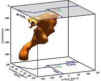 Seismic imaging was used by University of Utah scientists to construct this picture of the Yellowstone hotspot plume of hot and molten rock that feeds the shallower magma chamber (not shown) beneath Yellowstone National Park, outlined in green at the surface, or top of the illustration. The Yellowstone caldera, or giant volcanic crater, is outlined in red. State boundaries are shown in black.