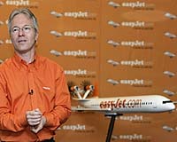 Low cost airline EasyJet Chief Executive Andy Harrison unveils a new jet airline design called the - easyJet ecoJet - which will emit 50% less C02 and be 25% quieter than the most current aircraft currently in service, at a press conference in London, 14 June 2007. EasyJet became the latest carrier to set out its green credentials by announcing planned cuts in CO2 emissions. EasyJet Chief executive Andy Harrison said the airline aimed to slash emissions by 50% by 2015. Photo courtesy AFP.